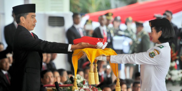 Presiden Jokowi (kiri) menyerahkan Bendera Merah Putih kepada anggota Paskibraka, Maria Felicia Gunawan, saat Upacara Peringatan Detik-detik Proklamasi 17 Agustus di Halaman Istana Merdeka, Jakarta, 17 Agustus 2015. Foto: ANTARA