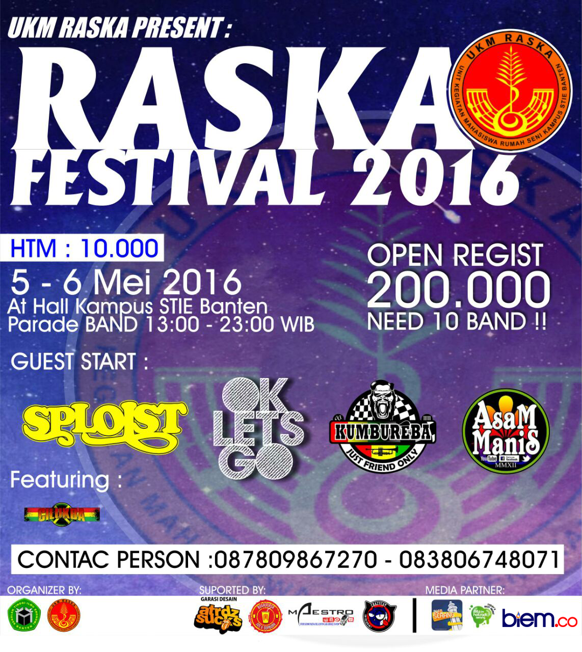 biem.co – Berperan aktif dalam meramaikan kesenian serta memberi wadah untuk para remaja dalam menyalurkan bakat seni, Unit Kegiatan Mahasiswa (UKM) Rumah Seni Kampus (RASKA) Sekolah Tinggi Ilmu Ekonomi (STIE) Banten, menggelar RASFEST 2016 dari tanggal 5 sampai 6 Mei mendatang.