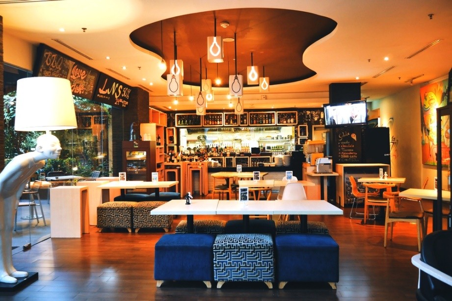 Makanannya oke, gimana dengan desain restonya? Nggak mau kalah artistik ternyata. Kamu akan melihat bangku makan warna warni cerah, dengan lampu gantung kotak dengan gambar bohlam. Dindingnya full dengan lukisan pastinya dan tetap dengan mural-mural cantik yang menjadi ciri khas hotel ini.