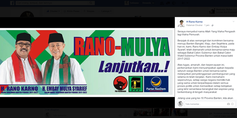 “Seraya menyebut nama Allah Yang Maha Pengasih lagi Maha Pemurah. Berpijak di atas semangat dan komitmen bersama menuju Banten Bangkit, Maju, dan Sejahtera, pada hari ini, kami, Rano Karno dan Embay Mulya Syarief, telah diamanahi untuk bersama-sama maju sebagai Bakal Calon Gubernur dan Bakal Calon Wakil Gubernur Provinsi Banten untuk masa bakti 2017-2022,” tulis Rano di halaman Facebook, Kamis (22/9/2016).
