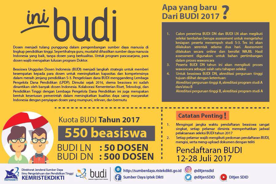 Maka dari itu, Beasiswa Unggulan Dosen Indonesia (BUDI) 2017 menjadi langkah strategis dan kesempatan kepada para dosen untuk meningkatkan kapasitas dan kompetensinya dalam meraih jenjang pendidikan S-3, mengingat untuk program pascasarjana para dosen wajib merupakan lulusan program Doktor.