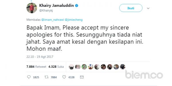 “Bapak Imam, Please accept my sincere apologies for this. Sesungguhnya tiada niat jahat. Saya amat kesal dengan kesilapan ini. Mohon maaf,” tulis Jamaluddin lewat akun twitternya.