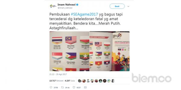 “Pembukaan SEA Games 2017 yang bagus, tapi tercederai dengan keteledoran fatal yang amat menyakitkan. Bendera kita….Merah Putih. Astaghfirullah…,” demikian tulis Menpora dalam akun twitternya.
