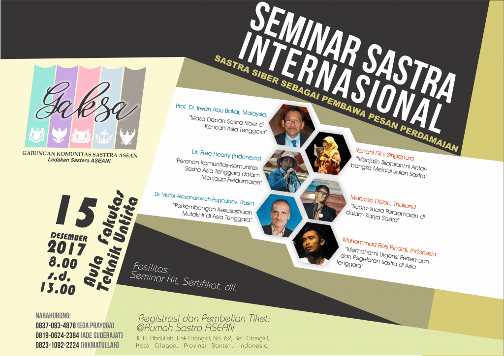 biem.co“Sastra Siber sebagai Pembawa Pesan Perdamaian” adalah tema yang diusung oleh Gabungan Komunitas Sastra ASEAN (GAKSA) dalam Seminar Sastra Internasional pada 15 Desember mendatang di Aula FT. Untirta Kota Cilegon.