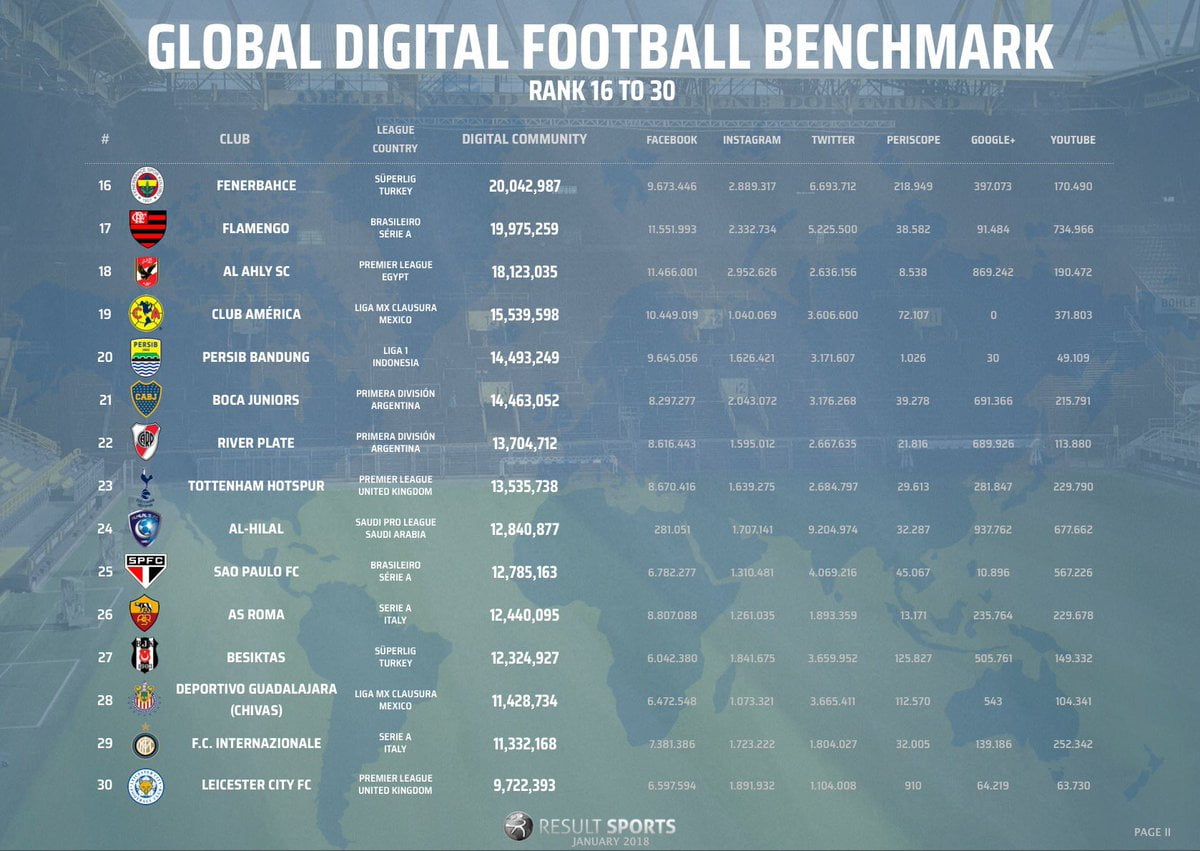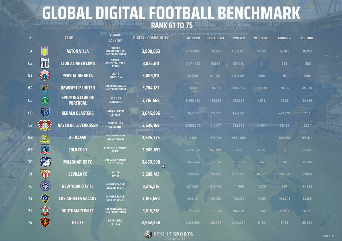 Sedangkan klub Indonesia lainnya yang masuk 70 besar klub populer di dunia, Persija Jakarta berada di peringkat 63. Skor yang diraih Macan Kemayoran di komunitas digital adalah berjumlah 3.809.911. Angka tersebut didapat dari 663.511 likers Fanspage Persija di Facebook, Instagram 664.294, Twitter 2.478.054, Periscope 1.818, Google+ 36 dan Youtube 2.198.