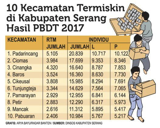 KABUPATEN SERANG, biem.co — Hasil Pemutakhiran Basis Data Terpadu (PBDT) tahun 2017 tercatat bahwa ada 69.331 Rumah Tangga Miskin (RTM) di Kabupaten Serang. Kecamatan Padarincang merupakan wilayah termiskin yang dihuni oleh 5.105 RTM dengan jumlah individu kategori warga miskin mencapai 20.839 orang.