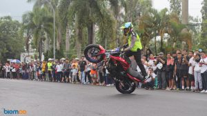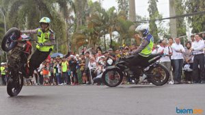 PANDEGLANG, biem.co — Ada yang berbeda dari car free day di pusat Kabupaten Pandeglang. Jika biasanya Polisi ada di jalanan untuk mengatur lalu lintas, kali ini mereka menunjukkan kebolehannya dalam beratraksi di atas kendaraan roda dua. Acara yang dimulai Minggu (03/03/19) ini berlangsung meriah.