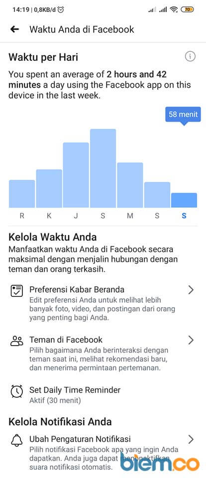Sampai tahap ini sobat telah masuk ke pengaturan “Waktu Anda di Facebook”. Pada bagian atas terdapat statistik laporan tentang berapa lama sobat menggunakan Facebook. Nah, untuk mengatur pengingatnya, sobat scroll ke bawah dan pilih “Set Daily Time Rimender”. Di sini sobat biem.co dapat bebas mengatur sesuai keinginan.