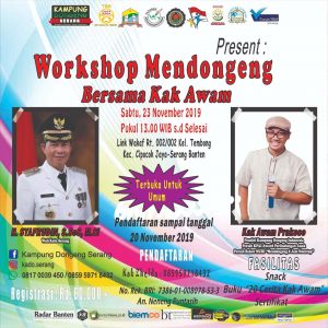 KOTA SERANG, biem.co – Setelah serangkaian kegiatan rutin setiap minggu, Kampung Dongeng (Kado) Serang rencananya akan diresmikan, Sabtu (23/11/2019) pukul 13.00 WIB di Sekretariat Lingkungan Wakaf Tanjak, Kelurahan Tembong, Kecamatan Cipocok Jaya, Kota Serang.