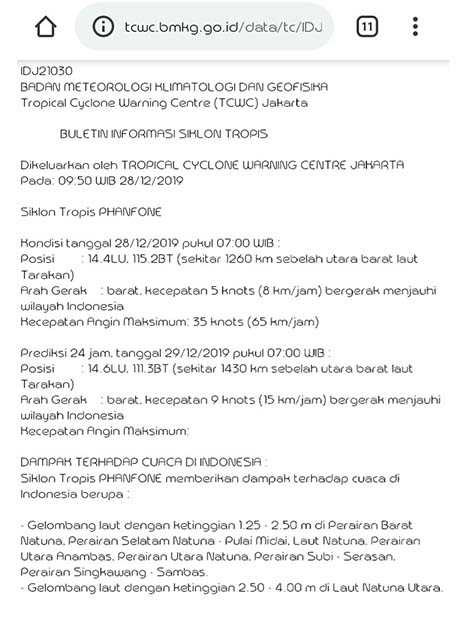 Dengan arah gerak, barat kecepatan 5 knot (8 km/jam) bergerak menjauhi wilayah Indonesia. Begitupun untuk tanggal 29/12/2019 siklon tropis Phanfone menjauhi wilayah Indonesia.