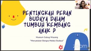 Pertunjukan Wayang Kancil Virtual selesai, Cyntia Handy dengan segera membuka materinya dengan mengajukan sebuah pertanyaan retoris: “Pentingkah peran budaya dalam tumbuh kembang anak?”