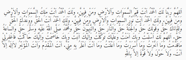 Allâhumma rabbana lakal hamdu. Anta qayyimus samâwâti wal ardhi wa man fî hinna. Wa lakal hamdu anta malikus samâwâti wal ardhi wa man fî hinna. Wa lakal hamdu anta nûrus samâwâti wal ardhi wa man fî hinna. Wa lakal hamdu antal haq. Wa wa‘dukal haq. Wa liqâ’uka haq. Wa qauluka haq. Wal jannatu haq. Wan nâru haq. Wan nabiyyûna haq. Wa Muhammadun shallallâhu alaihi wasallama haq. Was sâ‘atu haq. Allâhumma laka aslamtu. Wa bika âmantu. Wa alaika tawakkaltu. Wa ilaika anabtu. Wa bika khâshamtu. Wa ilaika hâkamtu. Fagfirlî mâ qaddamtu, wa mâ akhkhartu, wa mâ asrartu, wa mâ a‘lantu, wa mâ anta a‘lamu bihi minnî. Antal muqaddimu wa antal mu’akhkhiru. Lâ ilâha illâ anta. Wa lâ haula, wa lâ quwwata illâ billâh.