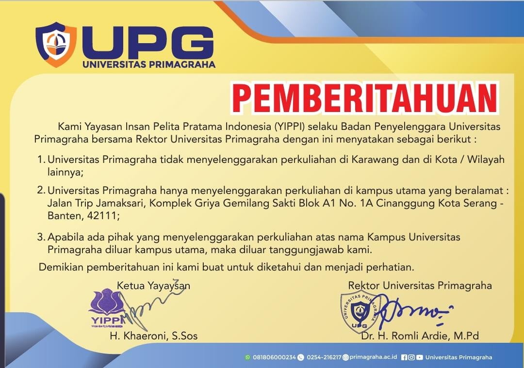 “Kami Yayasan Insan Pelita Pratama Indonesia (YIPPI) selaku Badan Penyelenggara Universitas Primagraha bersama Rektor Universitas Primagraha dengan ini menyatakan bahwa Universitas Primagraha tidak menyelenggararakan perkuliahan di Karawang dan kota / wilayah lainnya,” ujarnya.