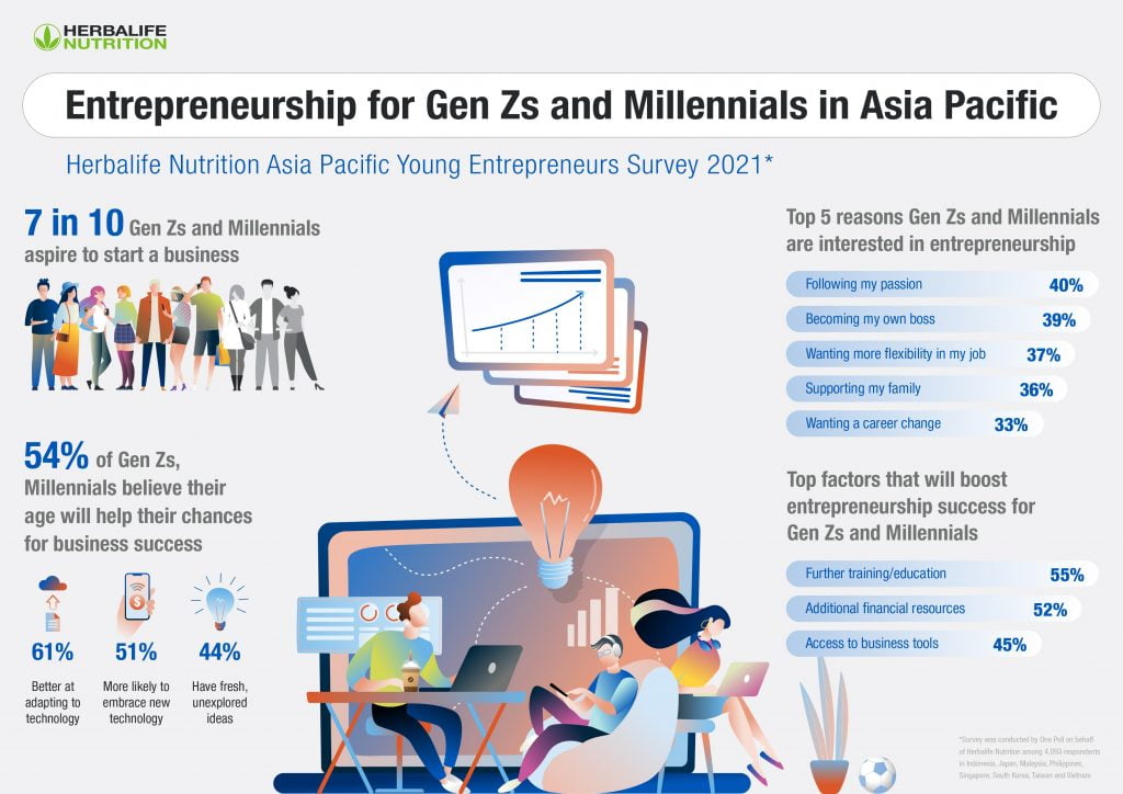 SINGAPURA, biem.co – Perusahaan nutrisi terkemuka di dunia, Herbalife Nutrition, mengungkap temuan dari Survei Pengusaha Muda Asia Pasifik 2021 pada hari ini, yang menemukan bahwa 72% Generasi Z dan Milenial di Asia Pasifik bercita-cita untuk memiliki bisnis sendiri. Survei tersebut menunjukkan bahwa hampir 9 dari 10 (87%) responden percaya bahwa usia terbaik untuk memulai bisnis adalah di bawah usia 40 tahun, dengan identifikasi rata-rata usia terbaik yaitu pada usia 27 tahun.