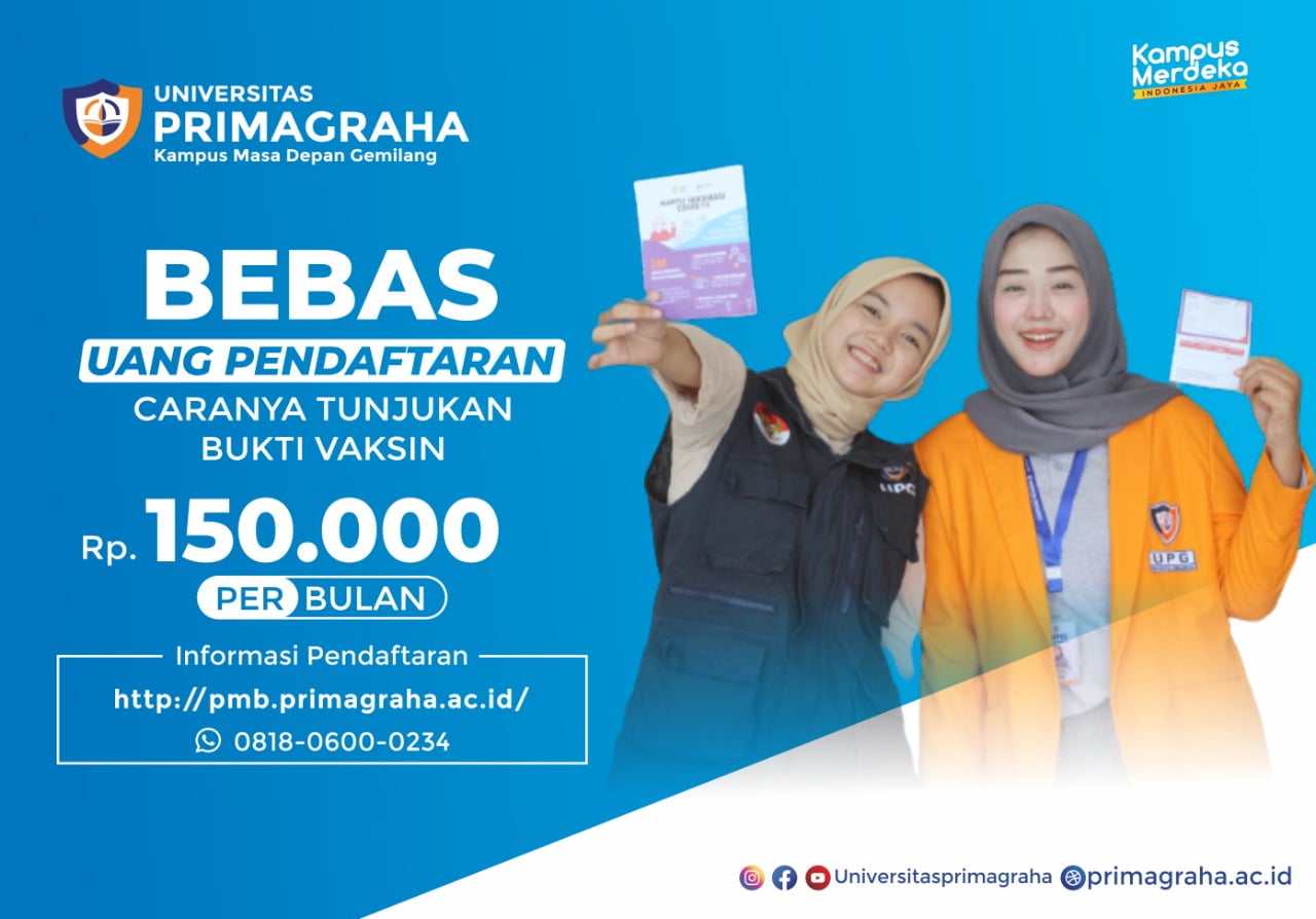 KOTA SERANG, biem.co – Ikut mendukung program vaksinasi massal dari Pemerintah Pusat dalam menekan penyebaran Covid-19. Universitas Primagraha (UPG) meluncurkan program bebas biaya registrasi kuliah bagi masyarakat/calon mahasiswa yang sudah melakukan vaksinasi.
