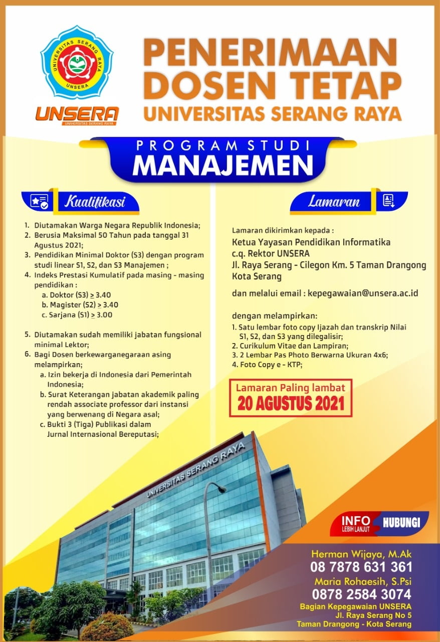 biem.co — Program studi Manajemen Universitas Serang Raya (Unsera) membuka kesempatan untuk menjadi dosen, dengan status sebagai calon pegawai tetap (Non PNS).