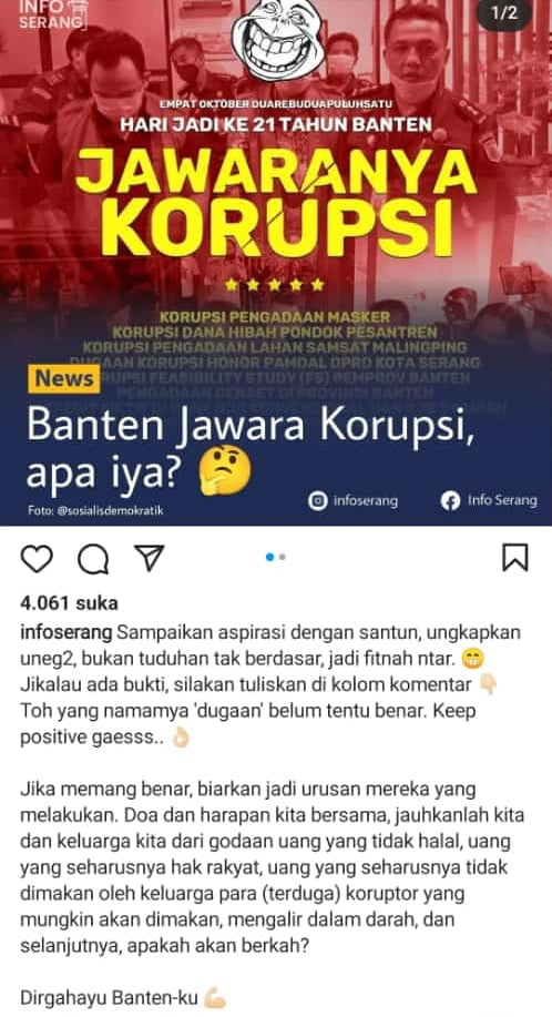 Untuk diketahui, poster yang diunggah oleh SWOT berisikan berbagai kasus korupsi yang saat ini tengah diselidiki, bahkan tengah disidang di pengadilan, seperti kasus Hibah Ponpes, Samsat Malingping dan Pengadaan Masker. Adapun narasi yang dipublikasikan oleh akun infoserang pada unggahan ulang poster milik SWOT sebagai berikut.