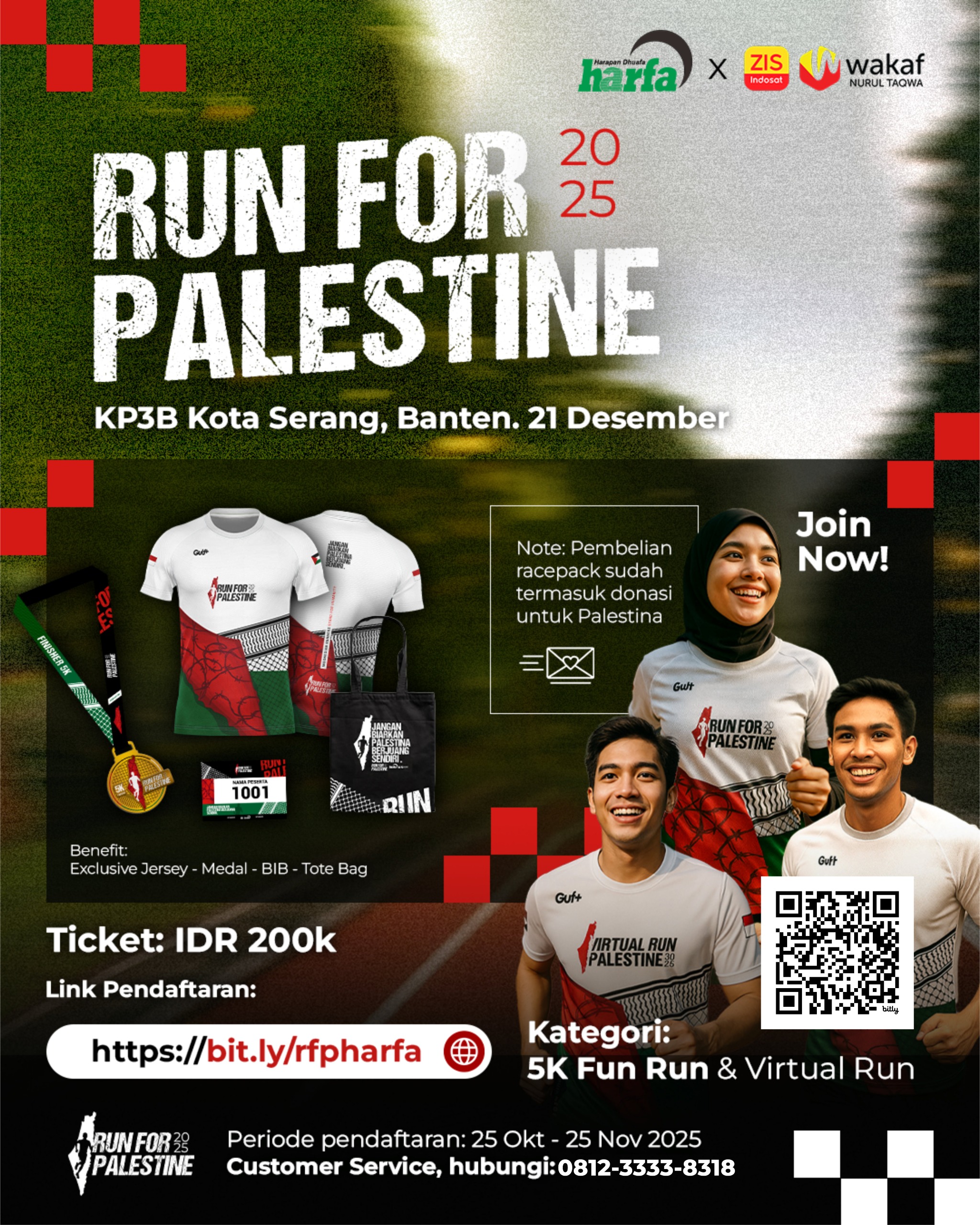 SERANG, biem.co – Sebagai wujud solidaritas terhadap rakyat Palestina, LAZ Harfa berkolaborasi dengan ZIS Indosat mengajak masyarakat Banten untuk ambil bagian dalam kegiatan Run for Palestine 2025 yang akan berlangsung pada 21 Desember 2025 di kawasan KP3B, Kota Serang.